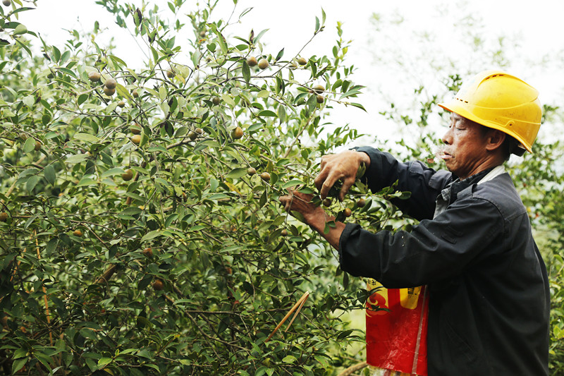 正在茶山采摘茶果的曾令干满脸笑容地告诉我们,他家共有20多亩油茶山,今年挂果较多,由于是适时采摘,出油率会比较高,预计可摘茶果60多担,产茶油400多斤,按每斤茶油70元计算,估计收入可达28000元。